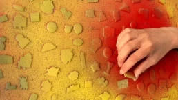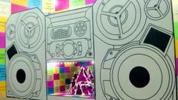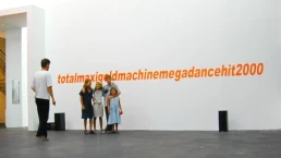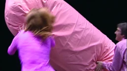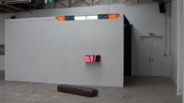 Une expérience physique et temporelle qui associe de manière improbable l’esthétique des jeux télévisés, la sculpture minimale, les décors et éléments de spectacles d’écoles maternelle et de parcs d’attractions. (jouer ?)