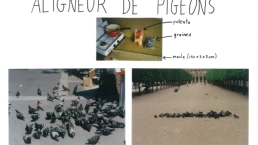 Assemblage d'une forme (l'abribus) et d'un matériau (couleur marron en léger reliefs piquants recouvrant les lampadaires et feux de signalisations) tous deux issu de l'espace urbain. (aller à l'abri)