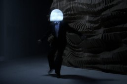Un danseur de claquettes portant un masque lumineux évolue la nuit, seul, parmi les œuvres d'une exposition. (voir le film)
