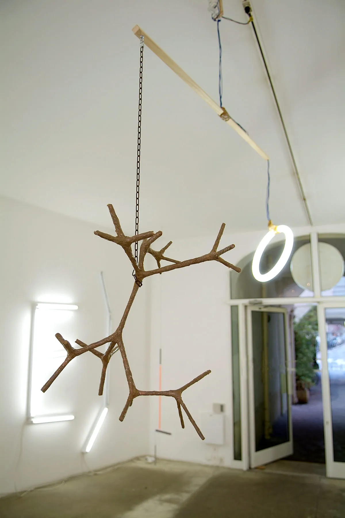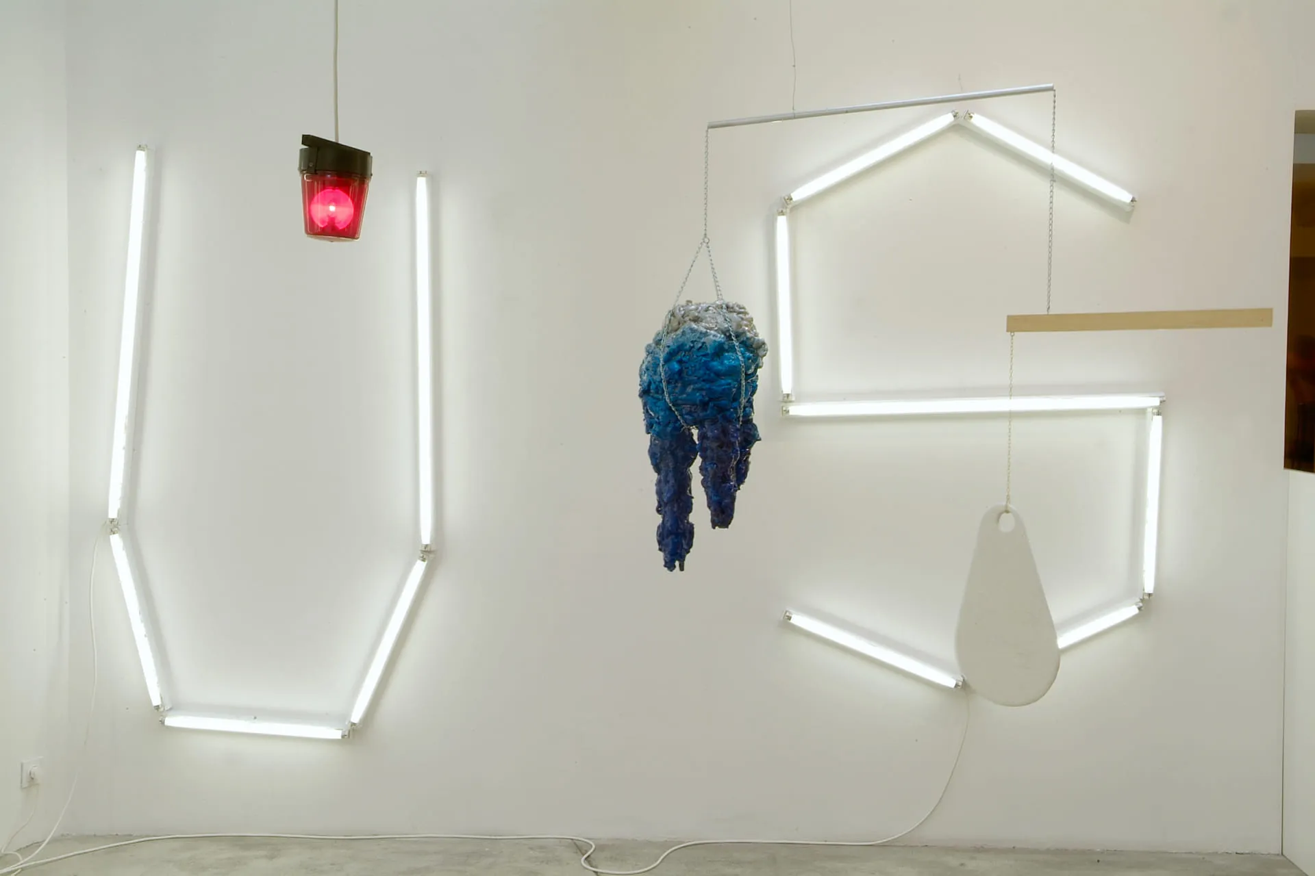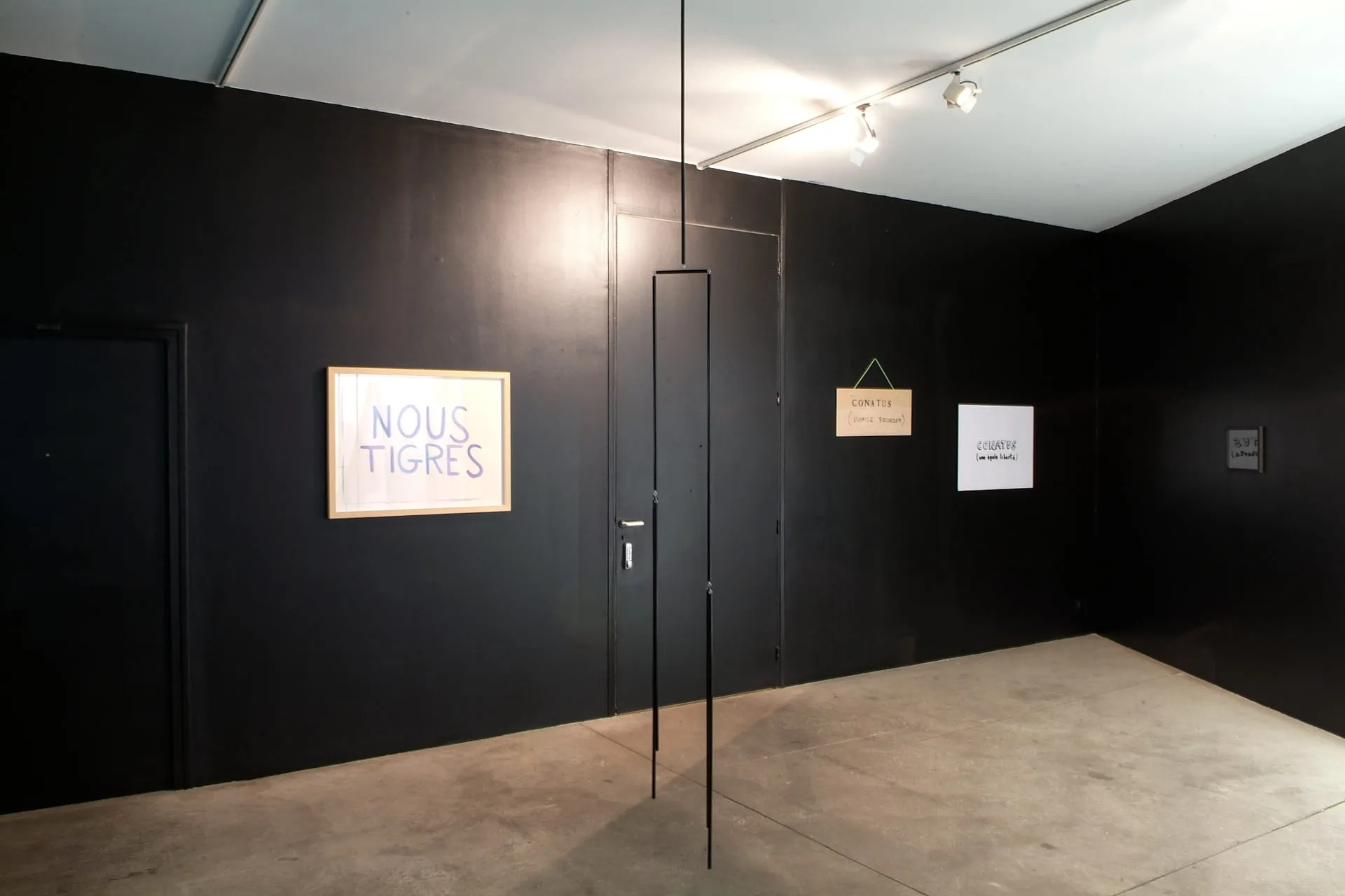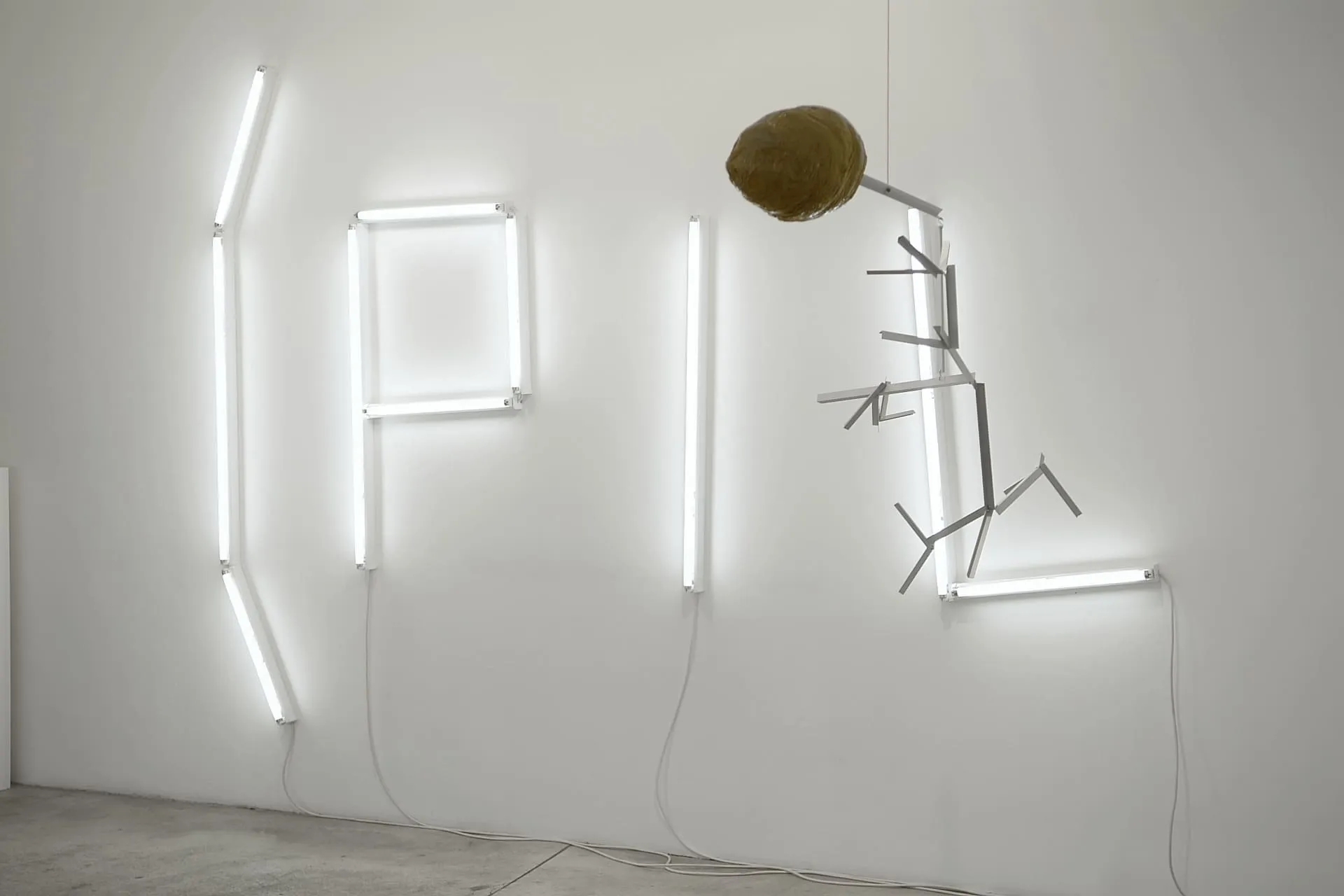 Pilote, if one refers to the vocabulary of television series, announces the prototype nature of the exhibition, prologue to a series of episodes ahead in wich the characters will be the works. The conatus, or the Spinozian concept of desire as a driving force, of the will of Man to persevere in its being and to increase its power to act is the founding principle of this new series. In this inaugural exhibition we shall meet: a platform on which elements lay which we find suspended in mobiles, the titles of the works becoming full works, the titles of the show made of 54 fluorescent lamps – as much as the exhibition has of days. An additional tube is randomly switched on every day, illuminating and energizing gradually the show. A movie presents the finding of elements presented on the platform.