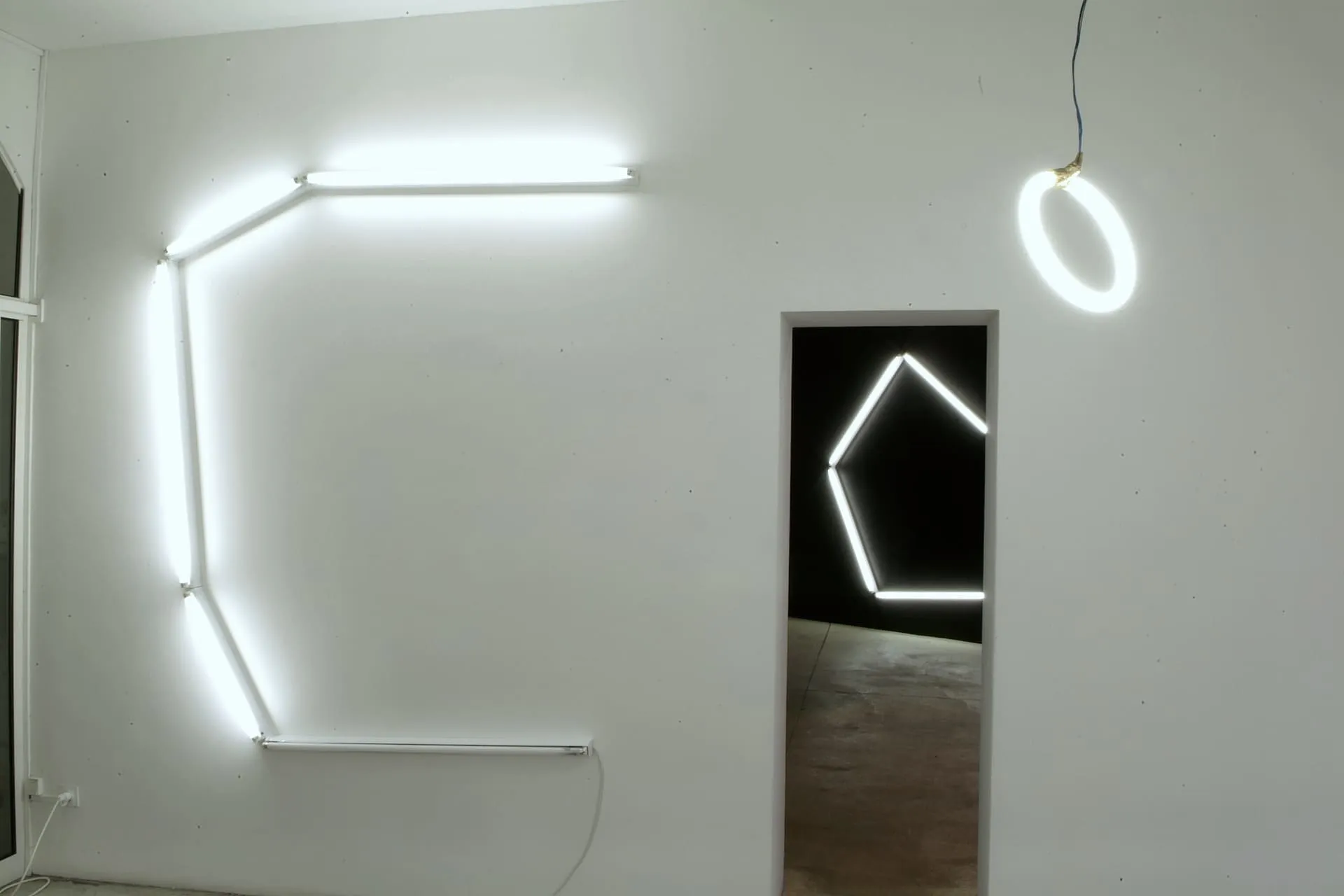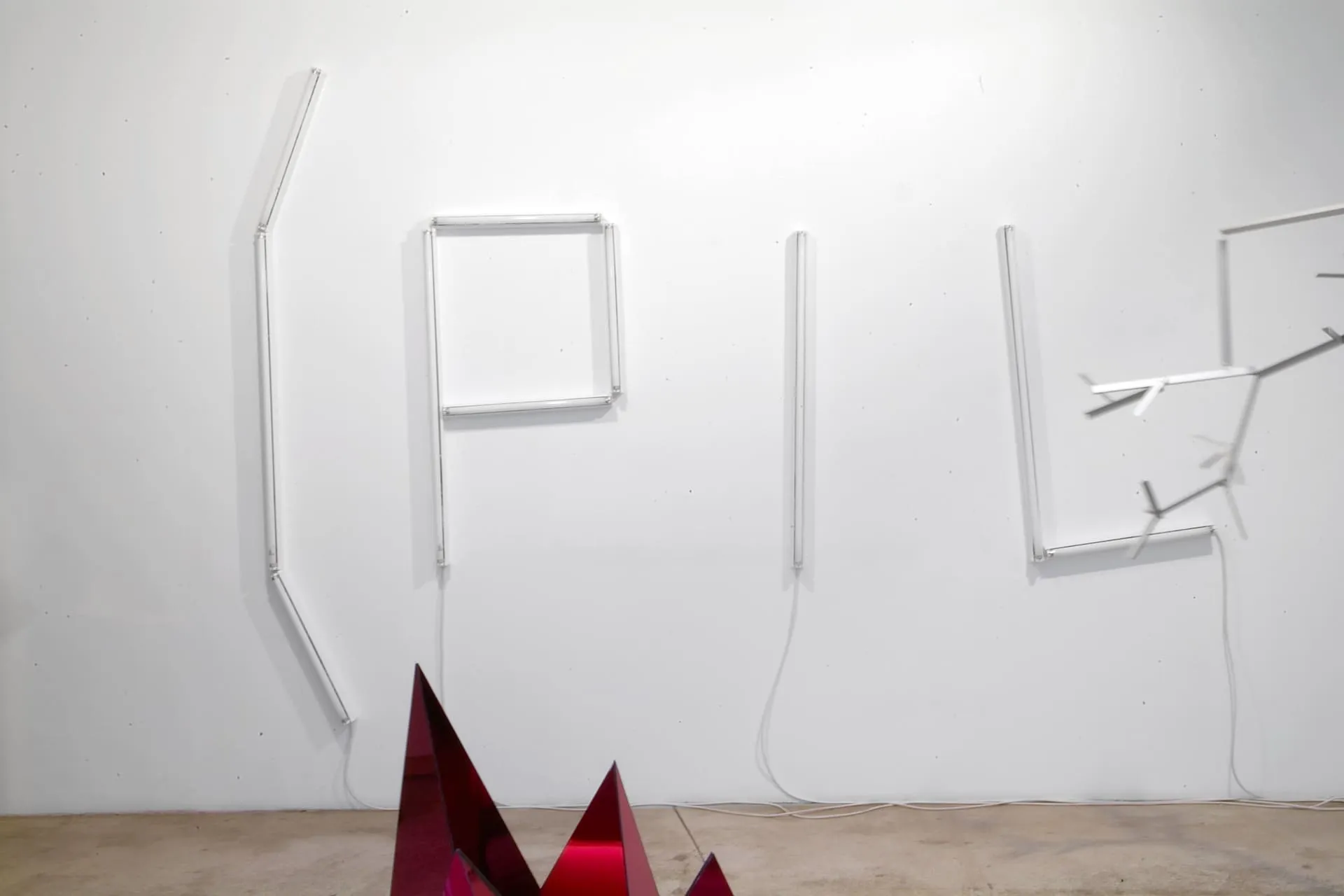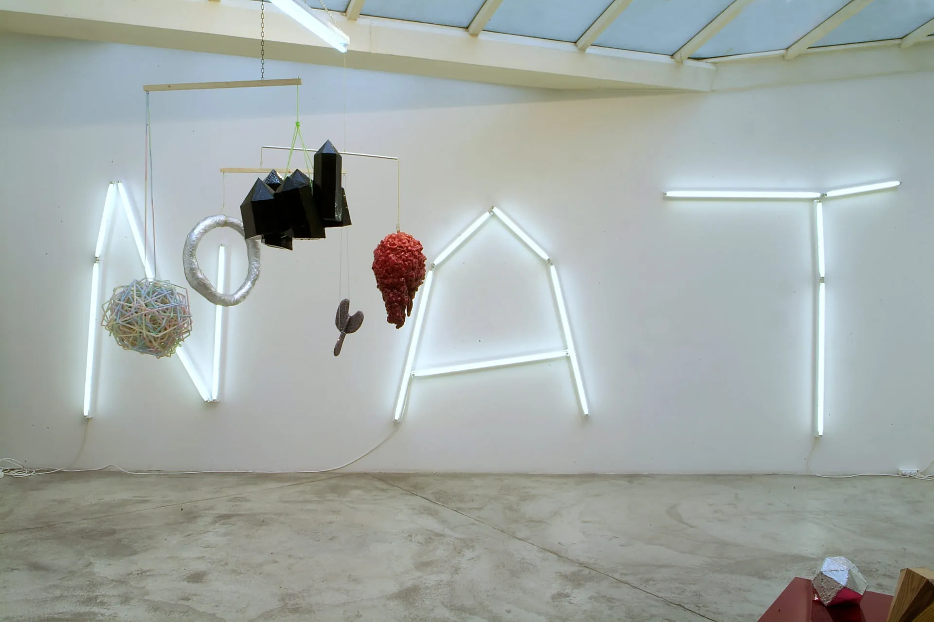 Pilote, if one refers to the vocabulary of television series, announces the prototype nature of the exhibition, prologue to a series of episodes ahead in wich the characters will be the works. The conatus, or the Spinozian concept of desire as a driving force, of the will of Man to persevere in its being and to increase its power to act is the founding principle of this new series. In this inaugural exhibition we shall meet: a platform on which elements lay which we find suspended in mobiles, the titles of the works becoming full works, the titles of the show made of 54 fluorescent lamps – as much as the exhibition has of days. An additional tube is randomly switched on every day, illuminating and energizing gradually the show. A movie presents the finding of elements presented on the platform.