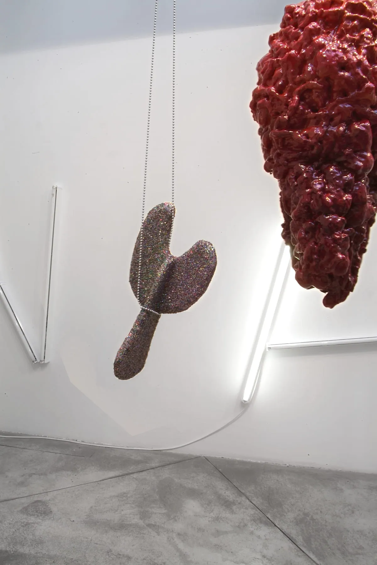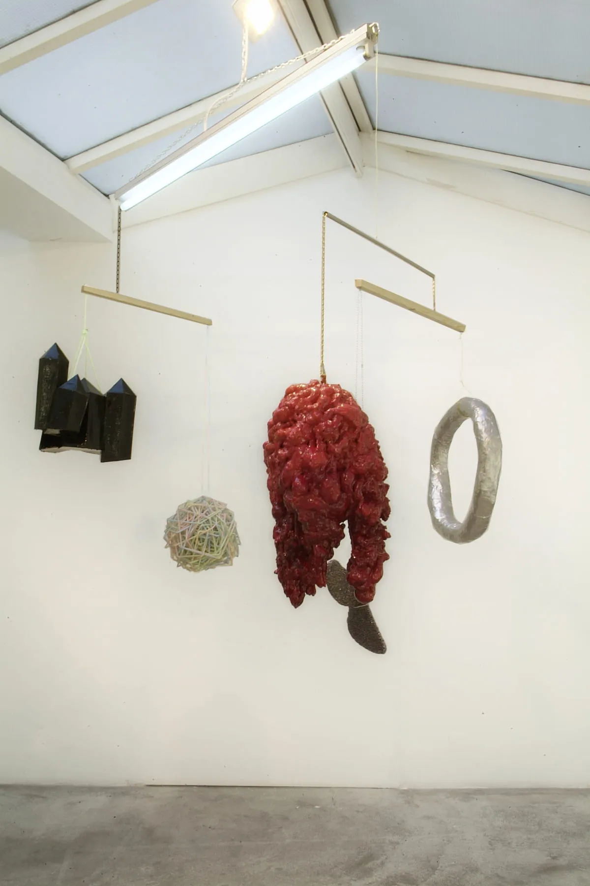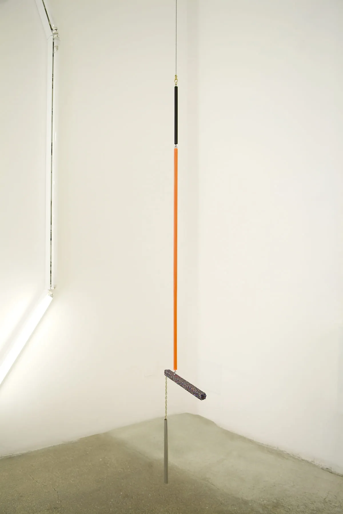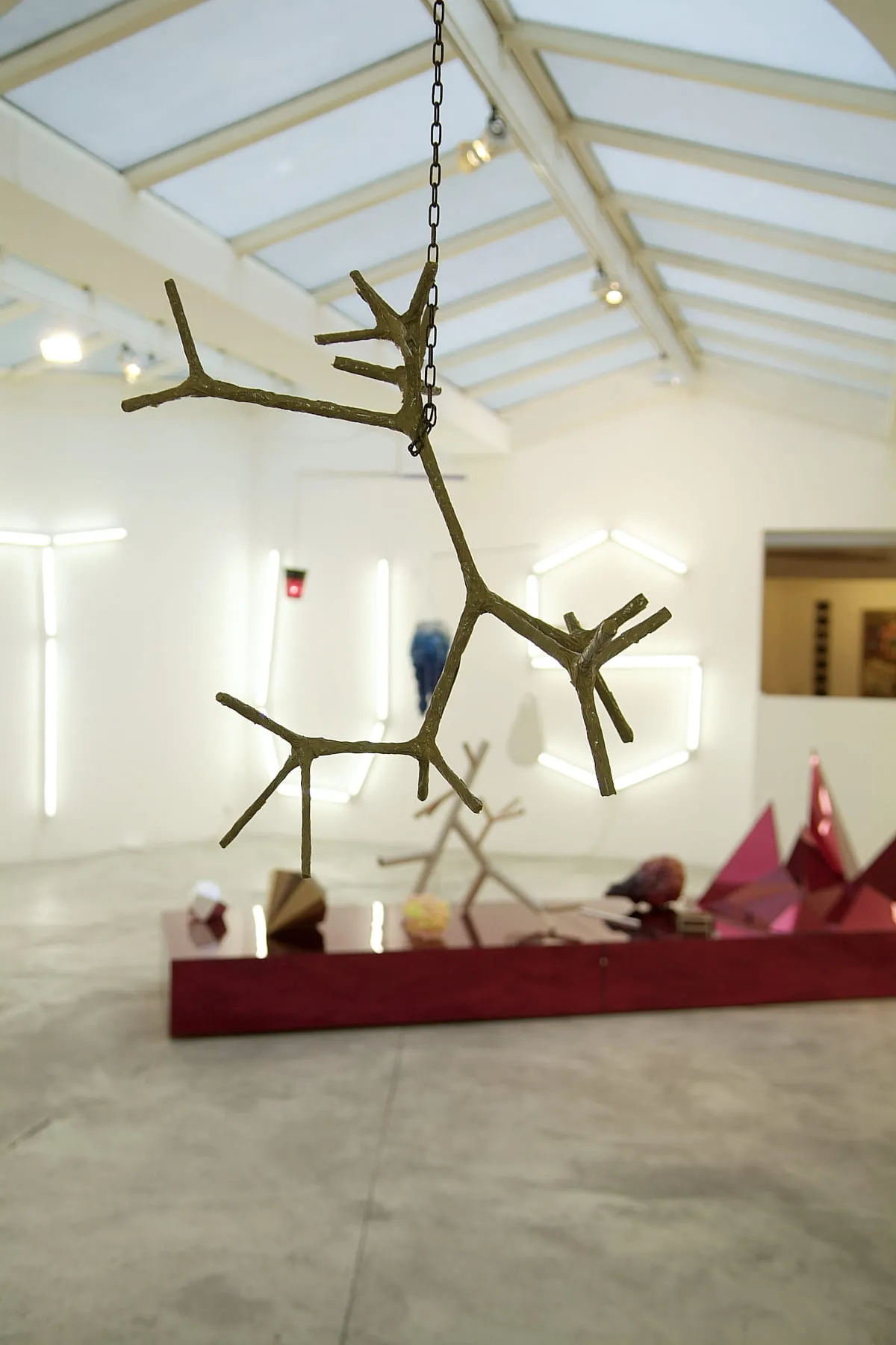 Pilote, if one refers to the vocabulary of television series, announces the prototype nature of the exhibition, prologue to a series of episodes ahead in wich the characters will be the works. The conatus, or the Spinozian concept of desire as a driving force, of the will of Man to persevere in its being and to increase its power to act is the founding principle of this new series. In this inaugural exhibition we shall meet: a platform on which elements lay which we find suspended in mobiles, the titles of the works becoming full works, the titles of the show made of 54 fluorescent lamps – as much as the exhibition has of days. An additional tube is randomly switched on every day, illuminating and energizing gradually the show. A movie presents the finding of elements presented on the platform.