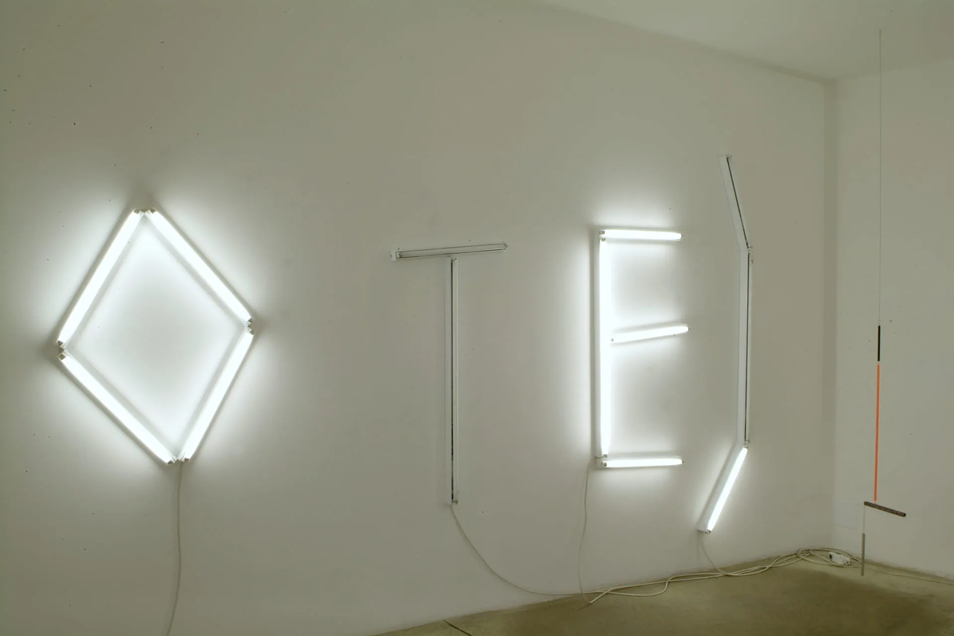 Conatus : Pilote, 2006, detail, variable size, 54 fluorescent tubes (as many as there are days in the exhibition). An additional tube is lit at random each day, gradually illuminating and energizing the exhibition.